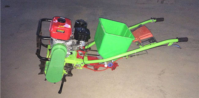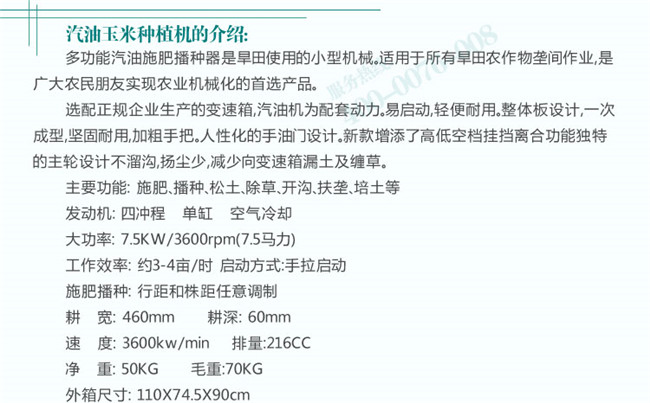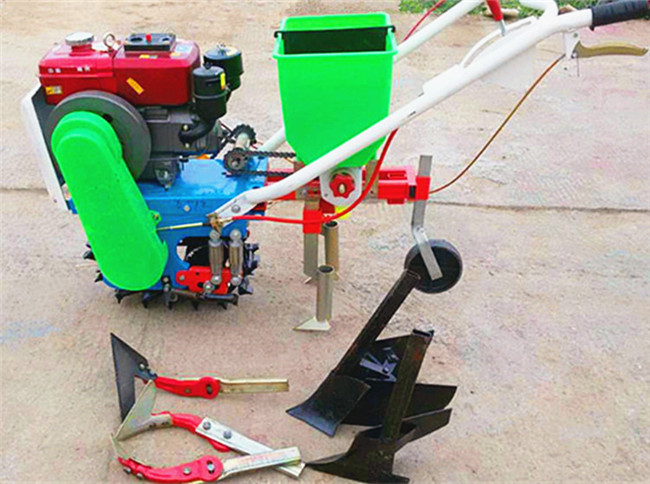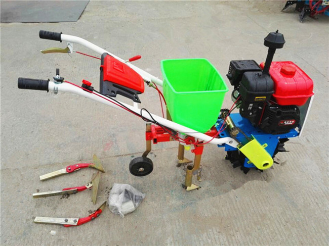 多功能汽油施肥播種器是旱田使用的小型機械。適用于所有旱田農(nóng)作物壟間作業(yè)。是廣大農(nóng)民朋友實現(xiàn)農(nóng)業(yè)機械化的首選產(chǎn)品。    選配正規(guī)企業(yè)生產(chǎn)的變速箱,汽油機為配套動力。易啟動,輕便耐用。整體板設計,一次成型,堅固耐用。加粗手把。人性化的.手油門設計。新款增添了高低空檔掛擋離合功能獨特的主輪設計不溜溝,揚塵少,減少向變速箱漏土及纏草。主要功能:施肥;播種;松土;除草;開溝;扶壟;培土等
